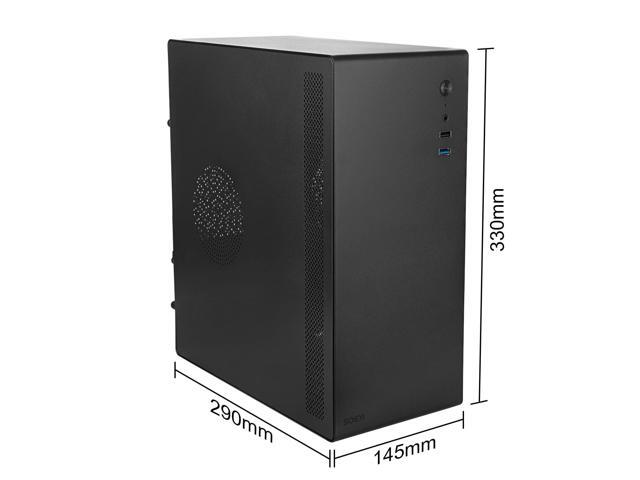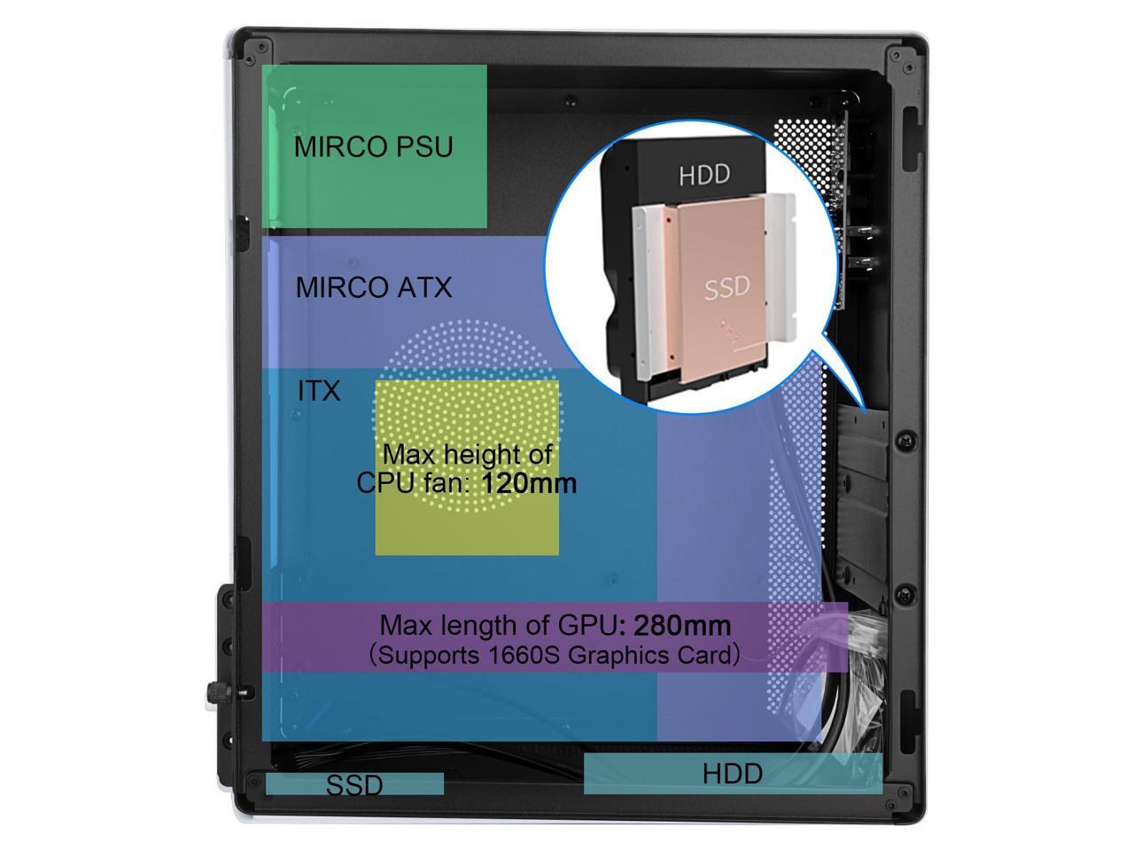 - Compatible accessories: Standard Micro ATX (SFX)power supply (4.9''x3.9''x2.5''). Maximum length of graphics card is 280 mm, maximum height of CPU cooler is 120 mm. Hard drive unit: HDD*2 + SSD*2