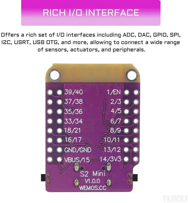 [Rich I/O Interface]: Despite its compact size, the ESP32-S2 HAT offers a rich set of I/O interfaces including ADC, DAC, GPIO, SPI, I2C, USRT, USB OTG, and more, allowing you to connect a wide range of sensors, actuators, and peripherals.
