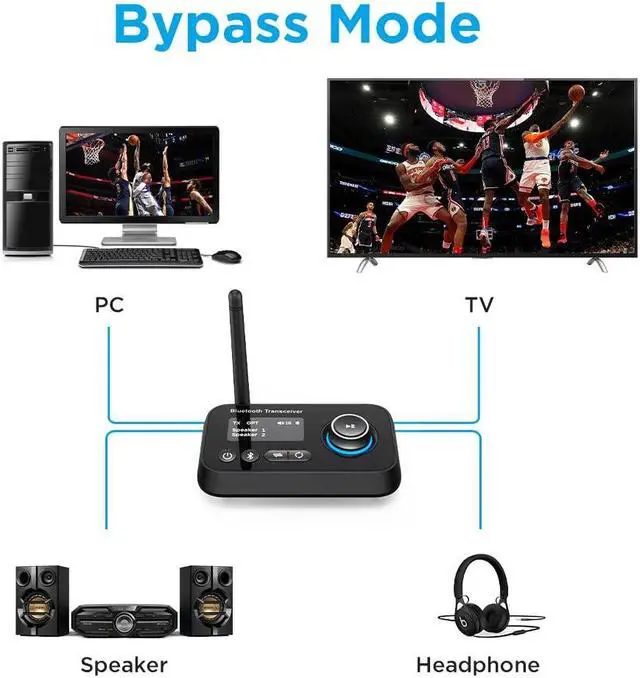 UNIQUE BYPASS FEATURES & DUAL DEVICES LINK: Get into bypass mode you can have option of listening to TV soundbar + headphones or speaker without disconnecting. Our bluetooth receiver transmitter can be paired with 2 Bluetooth devices simultaneously, so you can share music or movie without disturbing others. If you adjust the volume, the volume of both devices is adjusted simultaneously. If you're hearing impaired, it's also perfect with this bluetooth audio adapter.
