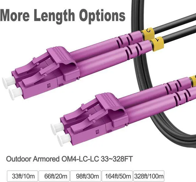 Long-distance transmission: Our OM4 lc to lc armored fiber patch cable provides 2000 MHz·km @850nm bandwidth, allowing for 10Gb Ethernet transmission up to 300 meters at 850nm wavelength. 40Gb Ethernet transmission distance can reach 240 meters at 850nm wavelength, while 100Gb Ethernet transmission distance can reach 100 meters at 850nm wavelength.