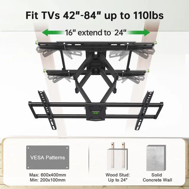 USX MOUNT Full Motion TV Wall Mount 42"-84" TVS, Fits 16" 18" or 24" Studs, Heavy Duty TV Mounts Bracket with Dual Articulating Arms Tilt Swivel Extension Max VESA 600x400mm, Weight Capacity 110lbs