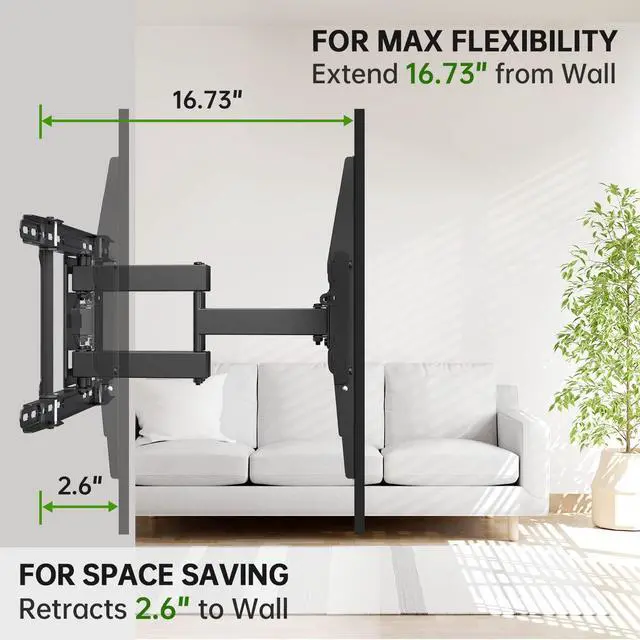 EXTENSION & EASY FOR CENTEROur TV Mount extend 16.73inch with Excellent range of motion, you can retract 2.6" to the wall to save place. The 24-inch extension wall plate is very smart. The position of the drilling hole is very flexible and very easy to center.
