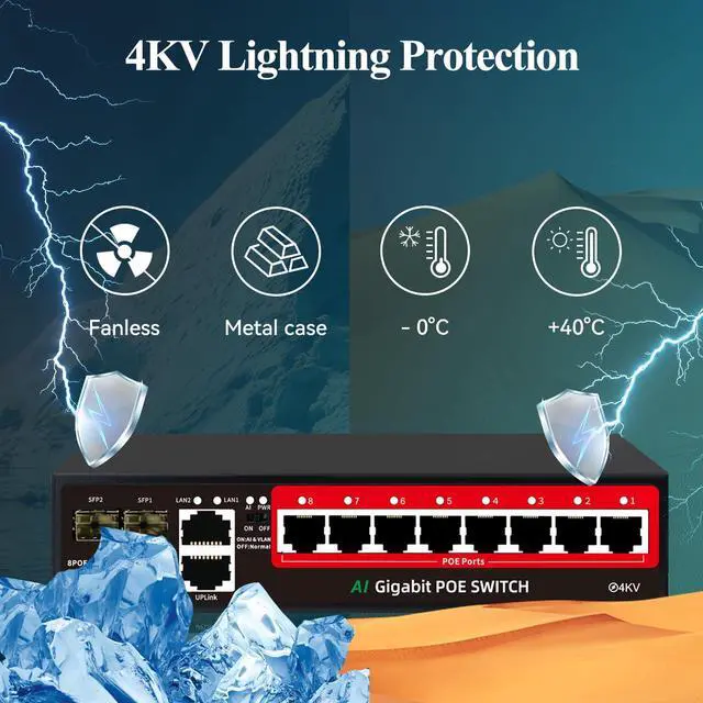 12 gigabit poe switch@120W PoE switch with 8 1000M PoE port + 2 1000M Uplink port and 2*1.25G SFP slot, 8×PoE ports providing up to 30W per port, total PoE budget 120W. 2 gigabit ethernet Uplink Port for connecting NVR and Internet , etc..