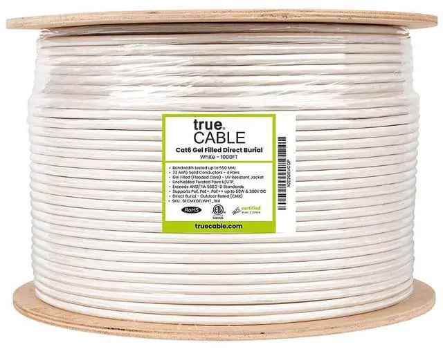 trueCABLE Cat6 Direct Burial, Gel Filled, 1000ft, White, Waterproof, CMX, 23AWG Solid Bare Copper, 550MHz, PoE++ (4PPoE), ETL Listed, Unshielded UTP, Bulk Ethernet Cable