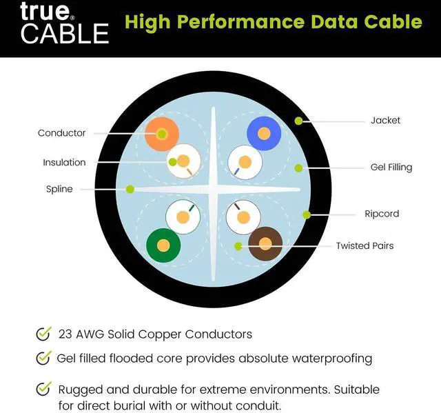 [Direct Burial Rated] Ultra-durable Cat 6 Ethernet cable for direct burial! Gel-filled core ensures complete waterproofing, and the UV-resistant jacket withstands harsh sunlight. Run it underground or in conduit for a reliable connect