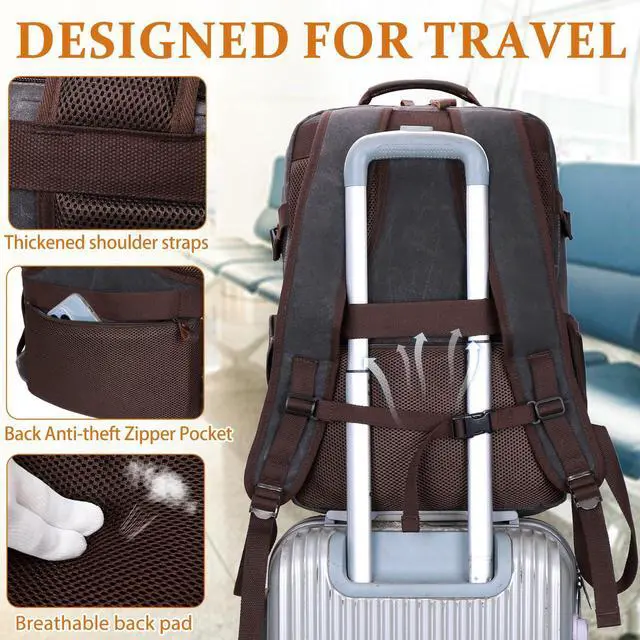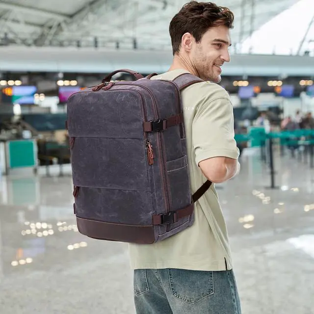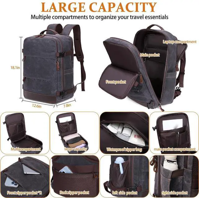 Dimensions & MaterialThe dimension of BOVIP travel backpack for men is 18.1 x 12.6 x 7.8 inches. This travel laptop backpack is made of high-quality waxed canvas, lightweight, water resistant fabric, ensure a long-term use. Comfortable soft padded back design with thick and soft breathable padding, this carry on travel backpack gives you maximum back support.