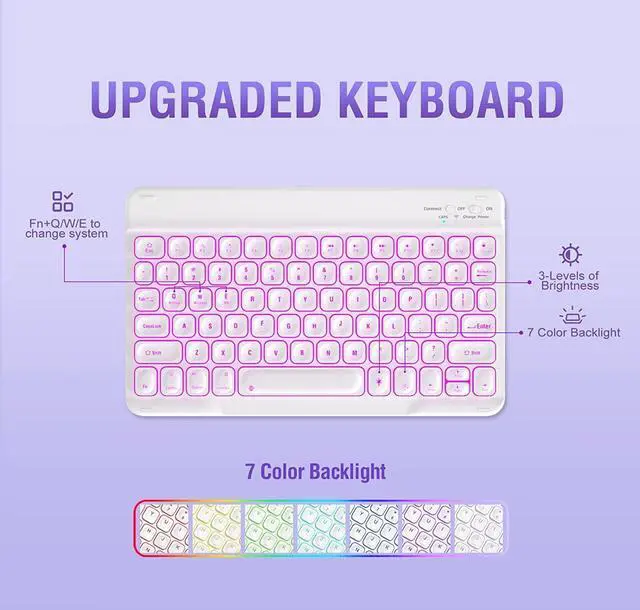 Detachable Backlit Keyboard7-color backlit keyboard for iPad 6th generation with ergonomic and mechanical scissor keys for a comfortable and noise-free typing experience, even in low light environments.