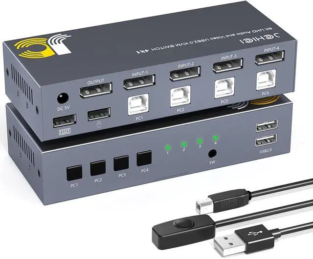 KVM Switch DisplayPort 8K@60Hz, 4 Way DP KVM Switcher for 4 Computer Share 1 HD Monitor and USB Keyboard Mouse, with 4 USB Cable & Wired Remote