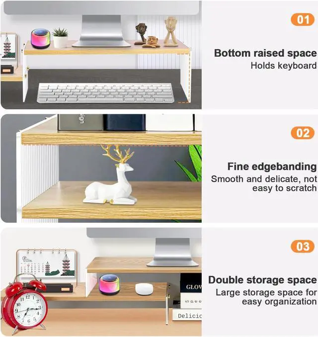 Dual Monitor Stand Design: Our Monitor Stand Riser for Desk can accommodate two computer monitors, and even has extra space for office supplies such as mouse and keyboard, providing you with a comfortable office home environment