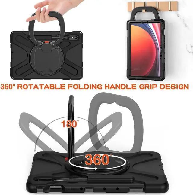 [Multi-Function Features] 360°rotating +180°folding grip can be used as a handle, easy to hang your Tablet in kitchen, washroom, bedroom; Kickstand is stable enough to stand on different surfaces for children to view.