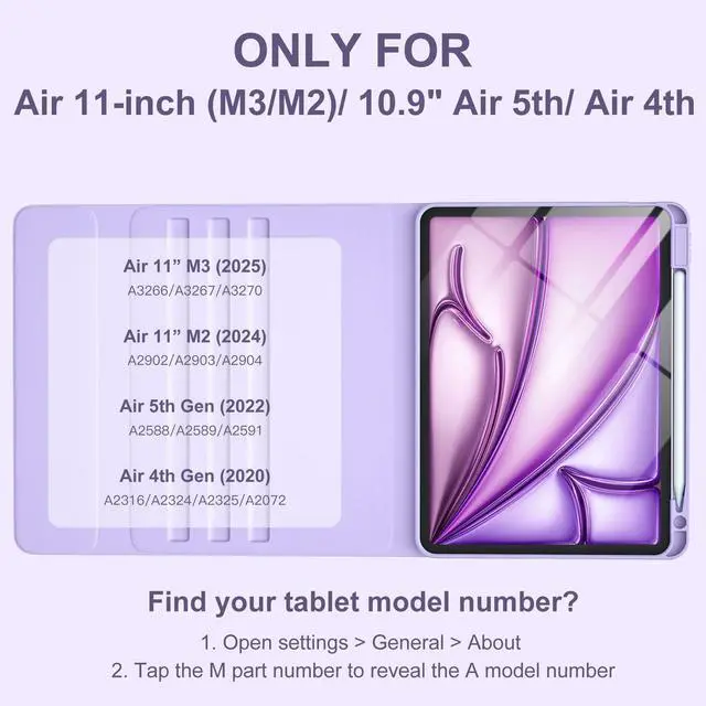 CompatibilityThis air keyboard case is compatible for iPad Air 11-inch (M3) 2025 (Model Number: A2902/AA2903/A2904), for iPad Air 11-inch (M2) 2024 (Model Number: A3266/A3267/A3270), for iPad Air 5th Generation (Model Number: A2588/A2589/A2591), for iPad Air 4th Generation 10.9 inch (Model Number: A2316/A2324/A2325/A2072). Not for other devices. Please be kindly check the model number No. starting with the letter "A" of your tablet back before order