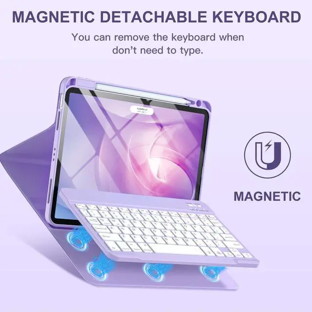 Detachable Backlit KeyboardThe keyboard compatible with iPad air 5/4 generation can be attached to the case with pretty strong magnets or detach completely. It is easy, fast and stable to connect via BT, reconnect immediately when turning it on. Using the optional backlight mode one color at a time or 7 colors breathing backlight, Picture yourself typing smoothly in the dark even at night for work