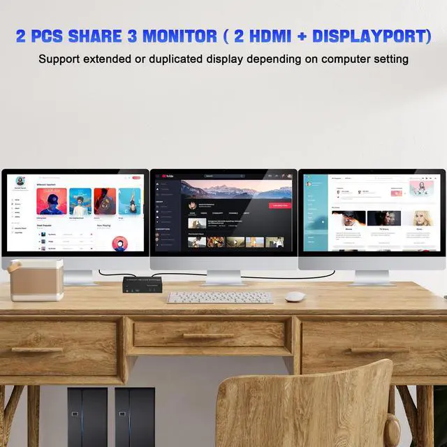 2 HDMI+ Displayport 3 Monitor KVM SWITCH: This 2 HDMI + 1 DP KVM switch is perfect for connecting 2 desktops or laptops to share 3 monitors and control them all with just one set of keyboard and mouse. Supports extended, mirrored displays; It requires every Laptop/PC support 3 screen or above display functions and must support extended display.