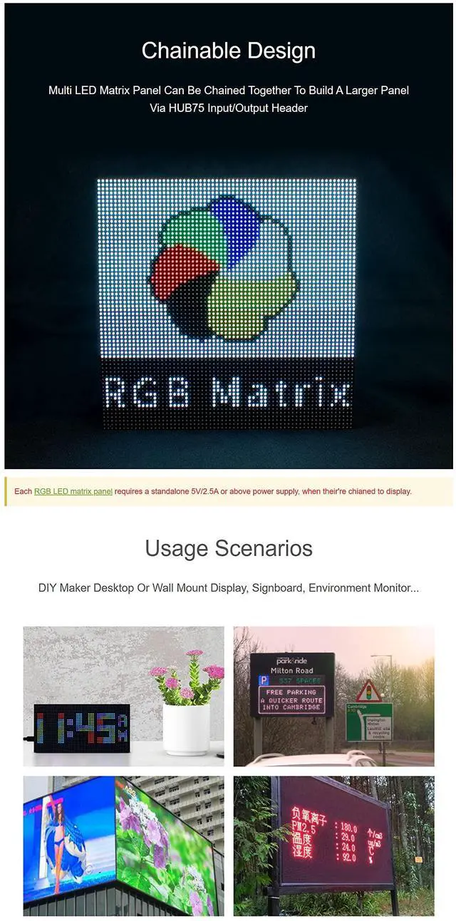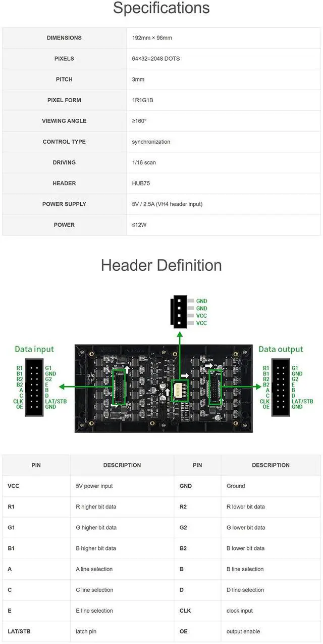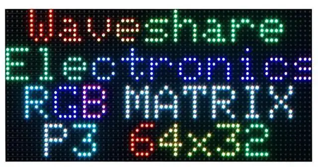 • 64×32 pixels, 3mm pitch, allows displaying text, colorful image, or animation