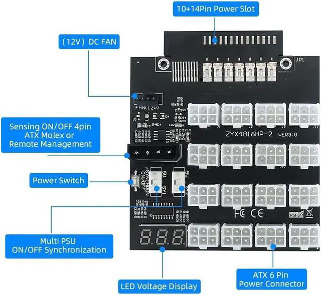 Flex Slot Server Power Board 14+10Pin to 16x6Pin Power Supply Board for CHIA ETH BTC Mining Miner
