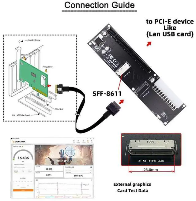 One PCIE PCI-Express 16x 4x device can be connected,The converter can be installed into the system internally through the SFF-8611/8612 oculink 8x interface.