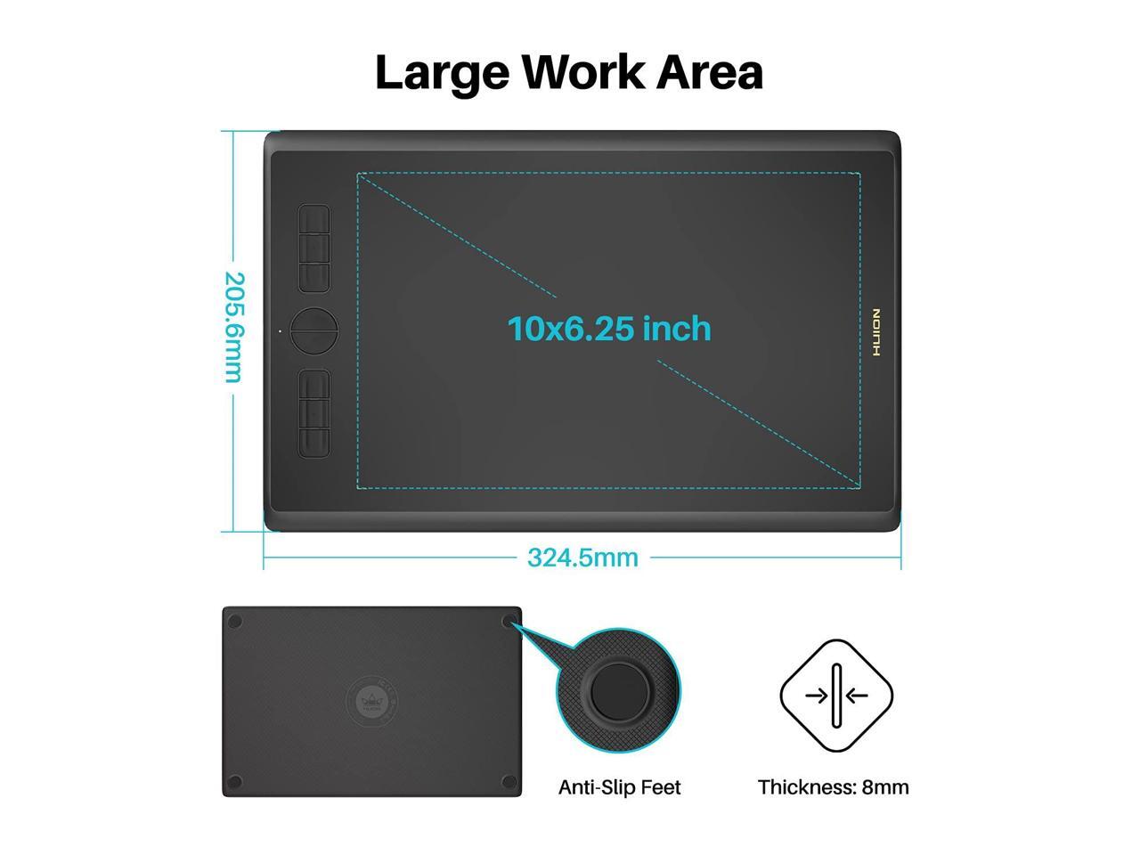 - Large Work Area - HUION Inspiroy H610X drawing tablet comes with 10x6.25 inches work area for drawing, sketching and modeling, which can match the screen of most laptops to assist you in better creation