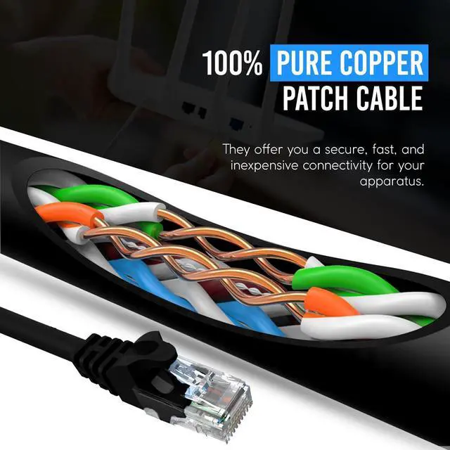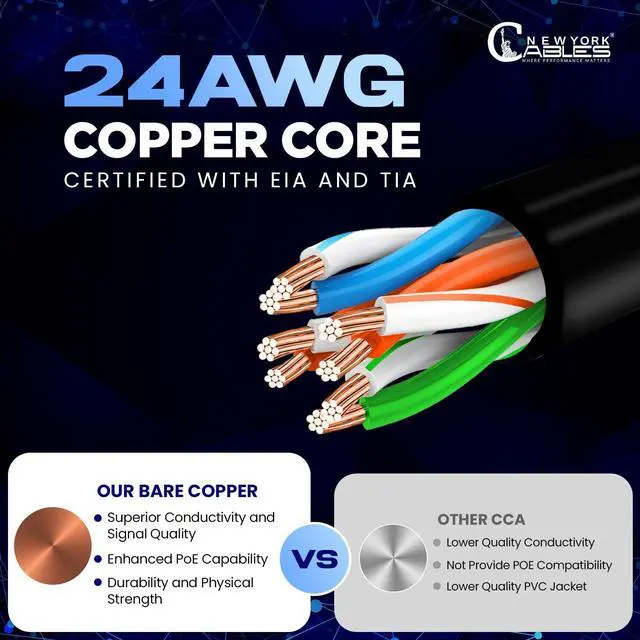 HIGH-PERFORMANCE ETHERNET CABLE NewYork Cables are Built with a 24 AWG copper wire core, each of the 4 unshielded twisted pairs (UTP) is separated by PE cross insulation to reduce crosstalk and ensure clear, high-speed data transmission upto 10Gbps