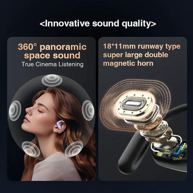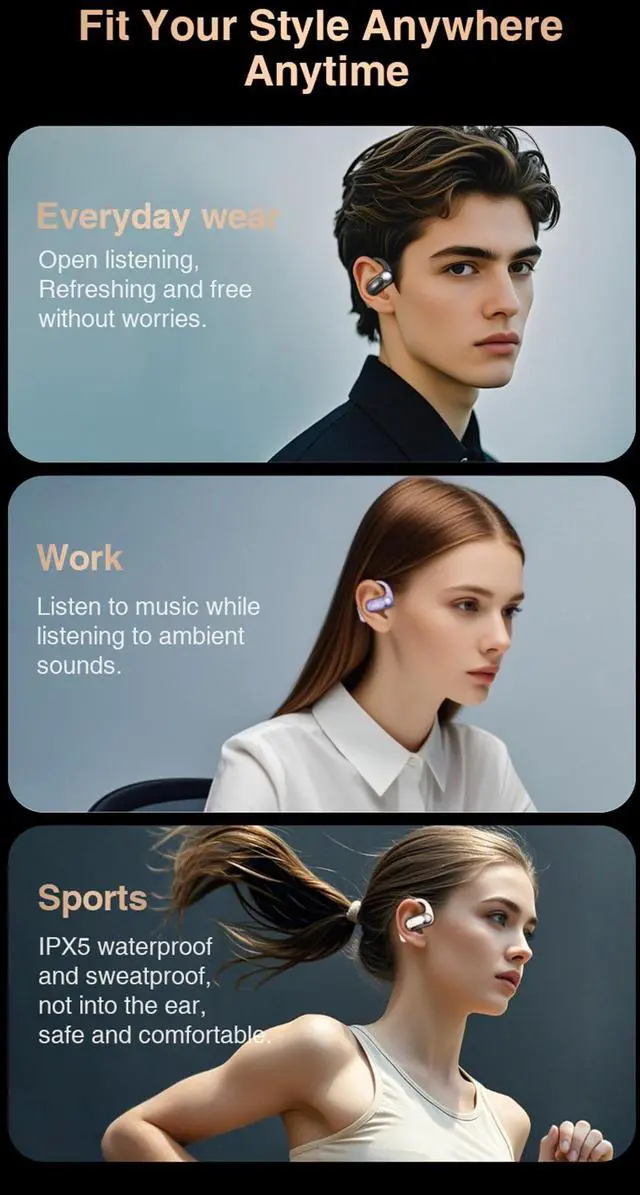 Open ear headphones Design ---Safe open earbuds wireless bluetooth ,In contrast to in-ear around the ear wireless earbuds, The open ear design of the bone conduction earbuds can help you always feel the surrounding environment. Whether you are cycling, walking, running, Gym, driving or riding with the open ear earbuds, you can always pay attention to the surrounding environment, which is very safe