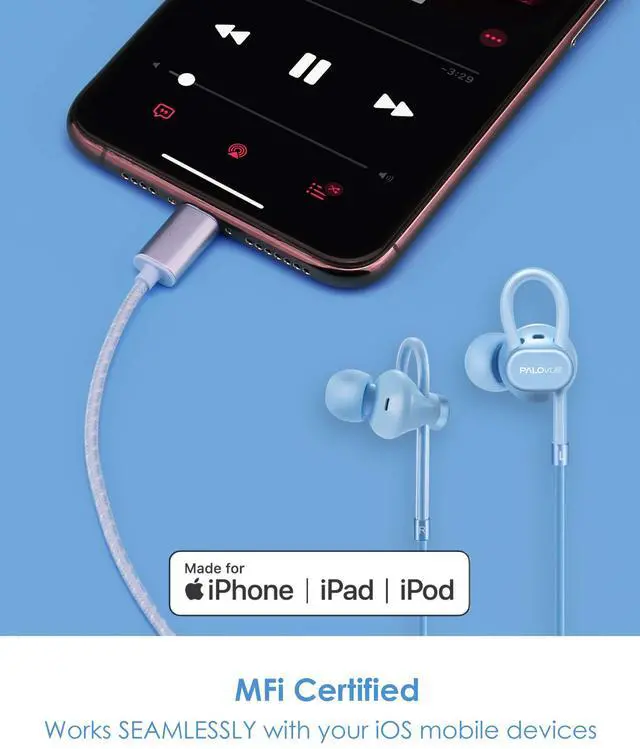 PALOVUE Lightning Earbuds with Microphone - MFi Certified Noise Isolation - Compatible iPhone 14/13/12/11 Pro Max/X/XS Max/XR/8/7 - NeoFlowColor Blue
