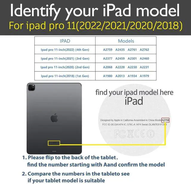 [COMPATIBILITY ] - Designed for the Apple iPad Pro 11" 2022 4th Generation (Model:A2435 / A2761 / A2762),iPad Pro 11 2021 (model:A2377, A2459, A2301, A2460), iPad Pro 11 2020 (Model: A2068,A2228,A2230,A2231) and iPad Pro 11 2018 (Model:A1980,A2013,A1934, A1979). Not compatible with any other iPad models.