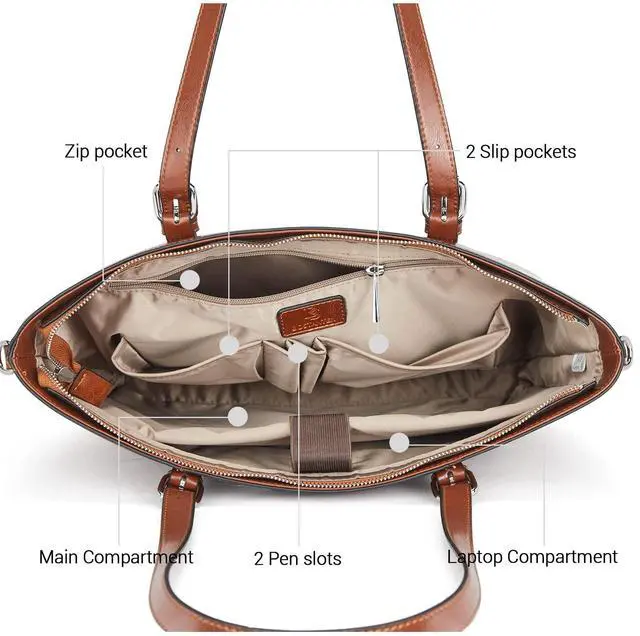 Structure - The main compartments including 1 laptop padded compartment, 2 slip pockets, 2 pen loops, and 1 inner zipper pocket. Padded compartment is secure for protecting your macbook or other 15.6-inch laptops. Dedicated pockets and slots for your wallet, pens and smart phone. There are one front pocket for quick access and one back zipper pocket. Ea