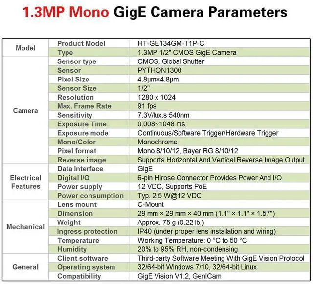HTENG VISHI Gigabit GigE Ethernet 1.3MP 1/2" Monochrome Global Shutter Industrial Camera Machine Vision C Mouth CMOS Area Scan Camera 1280X1024 91FPS