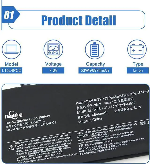 • Basic DetailsItem Model: L15L4PC2 ; Battery Type: Li-ion; Voltage: 7.6V; Capacity: 53Wh/6974mAh; Battery Color: Black;(The positive and negative poles of the cable will not affect the use).