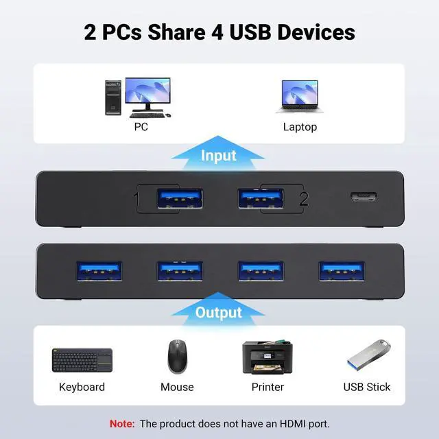 2 PCs Share Multiple Devices: UGREEN 2 in 4 out USB 3.0 switch supports 2 computers share 4 USB devices like keyboards, mouses, U disk, printers, scanners, USB cameras, headphones, etc. It's convenient for you to switch freely between your work computer and personal computer, greatly improving work efficiency. (*Not a KVM switch and does not support a monitor or video transmission.*)