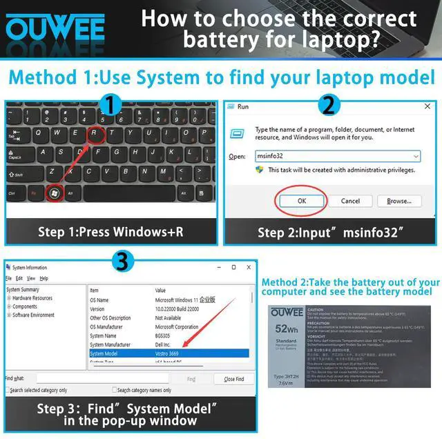 OUWEE 52Wh JHT2H Laptop Battery Compatible with Dell Latitude 7310 7410 Series Notebook P34S P34S001 35J09 0WY9MP 04V5X2 HRGYV 0HRGYV 7.6V 6500mAh 4-Cell