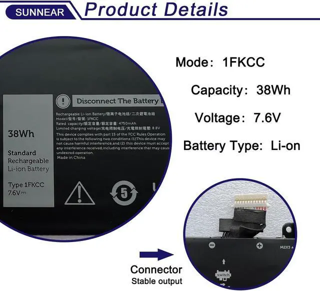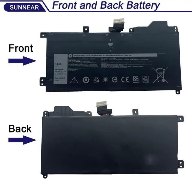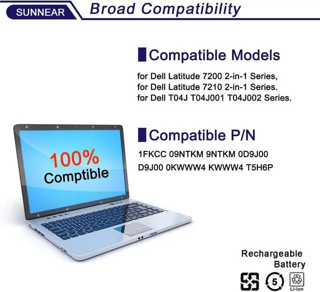 SUNNEAR 1FKCC Laptop Battery Compatible with Dell Latitude 7200 7210 2-in-1 Series Notebook T04J T04J001 T04J002 09NTKM 9NTKM T5H6P 0D9J00 D9J00 0KWWW4 KWWW4 7.6V 38Wh 4750mAh 2-Cell
