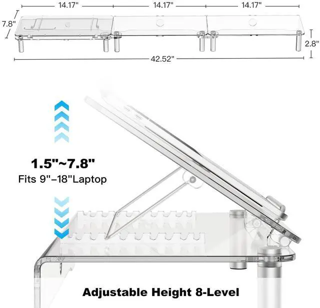 Adjustable HeightOur acrylic dual monitor stand is equipped with an adjustable laptop stand with a total of 8 different angles, allowing you to easily adjust the height of the stand to ensure the best screen position to meet your personal needs and preferences for optimal comfort