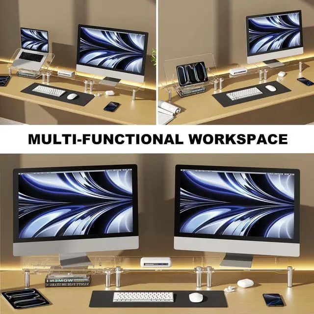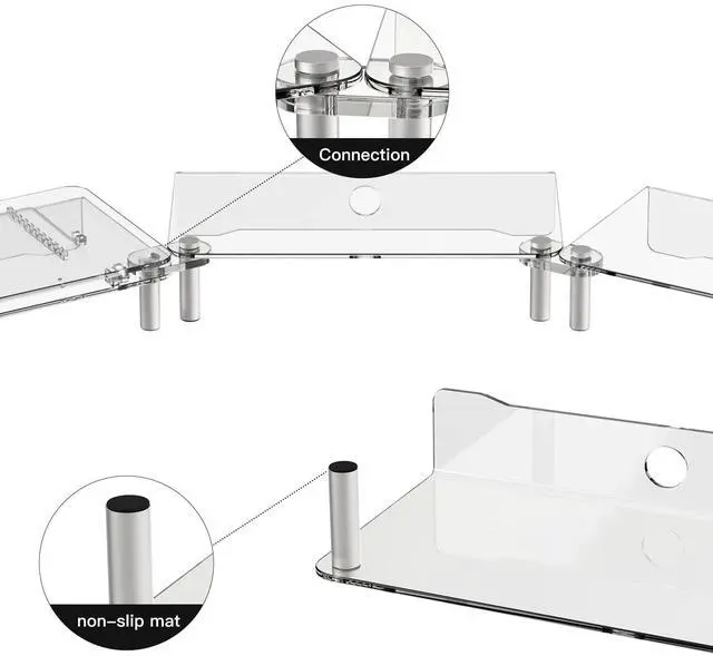 Durable and FashionableThis dual monitor stand is made of high-quality acrylic, providing not only sturdy support but also adding a stylish and modern touch to your workspace. This minimalist design features a smooth, crystal clear surface that complements any home or office decor and can support up to 55 pounds