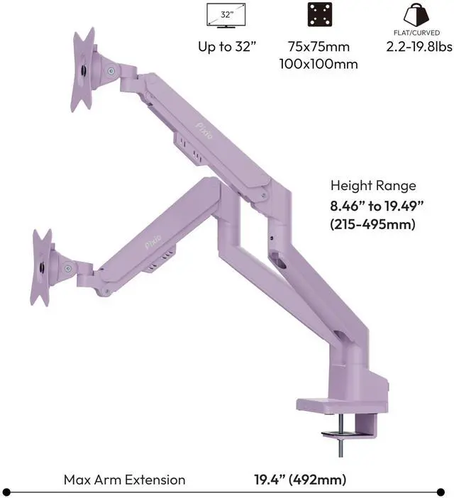 Pixio PS1D Wave Purple Dual Monitor Arm Stand Desk Mount - Fits up to 32 inches Monitors and up to 19.8lbs. VESA Compatibility and Integrated Cable Management