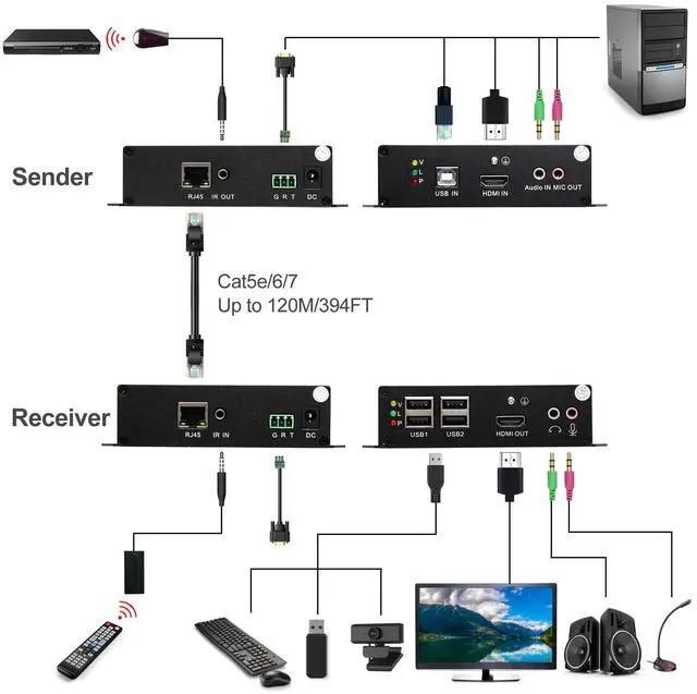 4K@30Hz KVM Extender : The hdmi & DVI kvm usb extender up to 394 feet (120 meters) over cat5e/6/7 with stereo audio, video, microphone, USB, IR, RS232 extension. No video loss with zero delay, with EDID pass-through