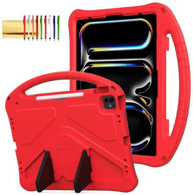 Kids Case for iPad Pro 13" 2024/Air 13" M3 M2, iPad Pro 12.9 2018-2022 Cover with Pencil Holder, Techcircle Lightweight Shockproof EVA Foam Handle Stand Anti-Slip Grip Rugged Case, Red