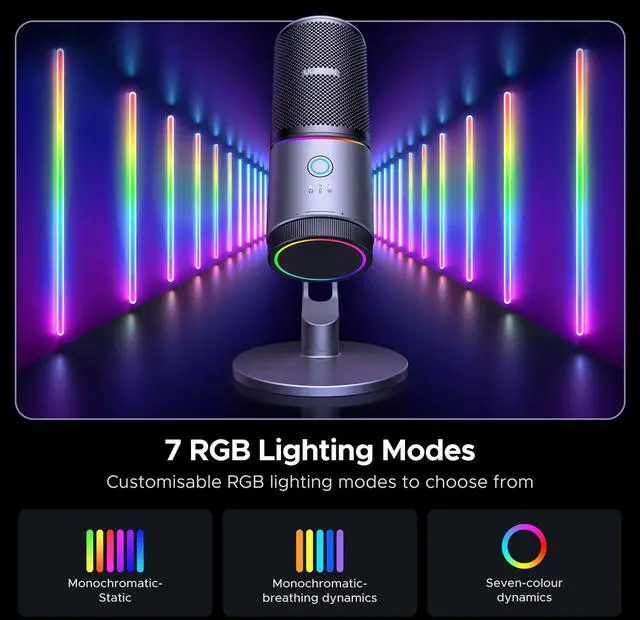 Dynamic RGB Lights: The microphone for pc has 7 RGB lighting modes, including a dynamic effect, 5 single colors, and a rainbow colors effect, adding a unique atmosphere to your recording environment. Whether you're streaming live or recording videos, these lighting effects create stunning visual effects that enhance the viewer's experience