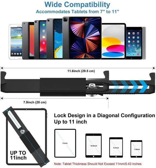 DEVICE COMPATIBILITY: This locking tablet stand supports 7.9"-11" devices, accommodating widths or heights from 7.9" to 11.6" and cases under 0.43" thick. Compatible models include Apple iPads (iPad, iPad Pro, iPad Mini), Microsoft Surface, Samsung Galaxy Tab, Google Pixel Slate, and Amazon Fire.