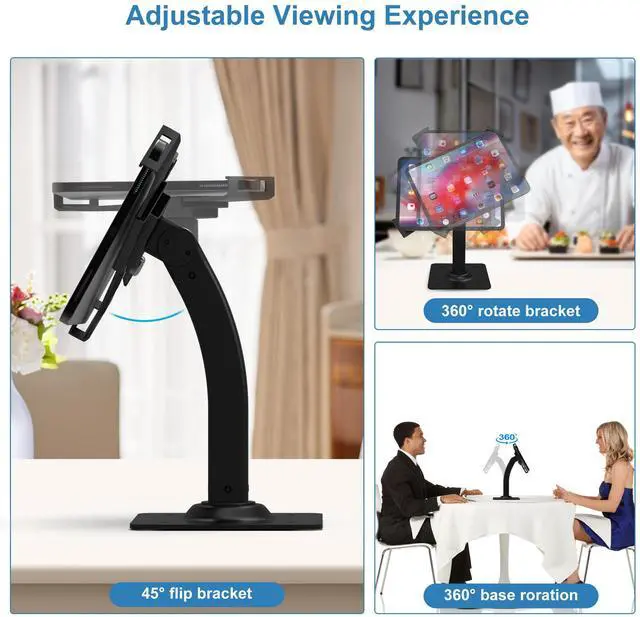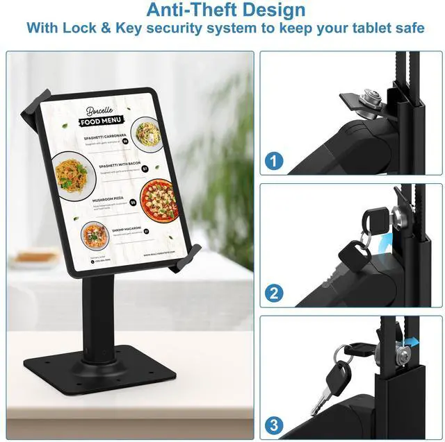 IMPROVED THEFT DETERRENCE: Equipped with a robust lock-and-key mechanism, our tablet POS stand ensures your device remains secure from theft and misuse. Crafted from sturdy high-grade aluminum, the entire locking stand anchors firmly to any desktop, offering a reliable anti-theft solution perfect for high-traffic areas like eate