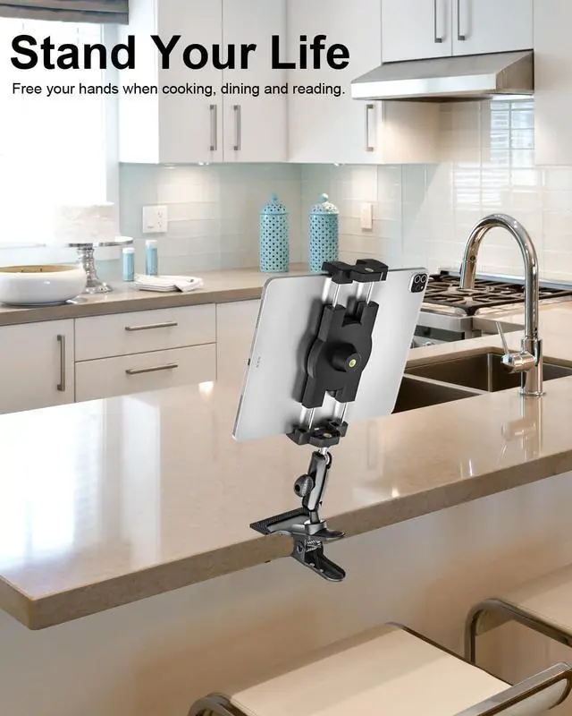 Kitchen Tablet Clamp MountThe clamp mount with adjustable base.The max clip range upto 6cm (2.36'').It can be used to kitchen, such as fix your tablet on the cabinet, you can easily learn how to make various delicacies. It fully unleashes your hands, making learning more convenient and simple.it also can be used in dining room, bedroom, table edge, bedside etc for online classesvideo recordingvideo callworking, studying, watching movies and so on.It makes your life simple and convenient.