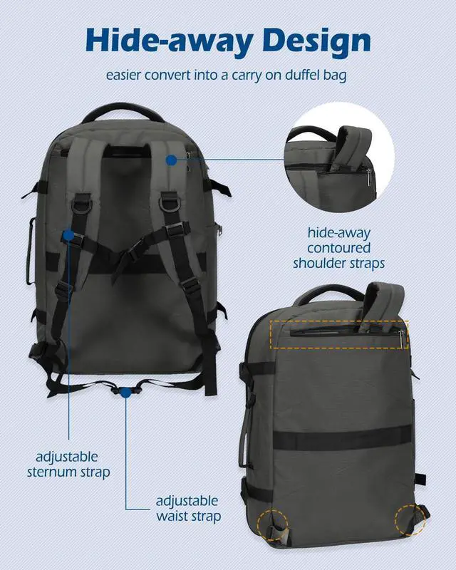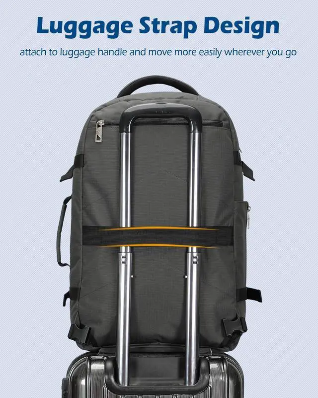 Pass Through Luggage Strapcarry on backpack is designed with an added back trolley strap for more convenient, you can quicker attach the travel cabin backpack to the luggage handle and move more easily around the airport or wherever you go; 4 compression straps help eliminate extra backpack space, making the carry on bag more compact, it can also relieve the pressure on the zippers, so if travel with a partially packed bag, you can preventing the contents from sloshing around