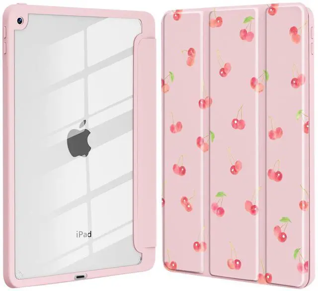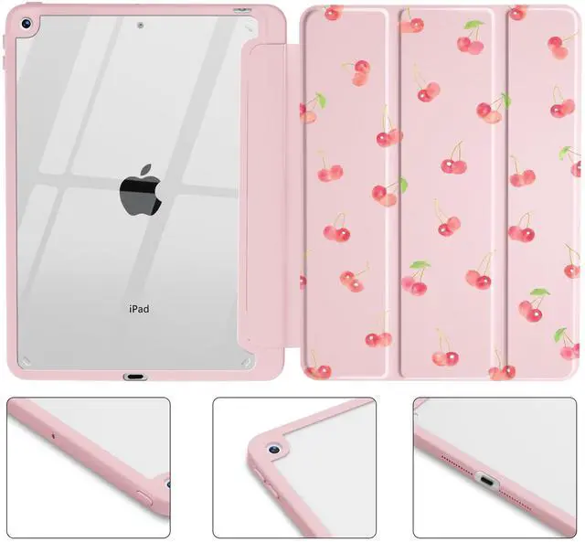 Idocolors Cute Cherry Case for iPad 7th/8th/9th Generation 10.2 inch, Clear Hard Back Cover with Pencil Holder, Tri-fold Stand Full Wrap Protective Case for Women Girls, Pink Cherry/Pink Case