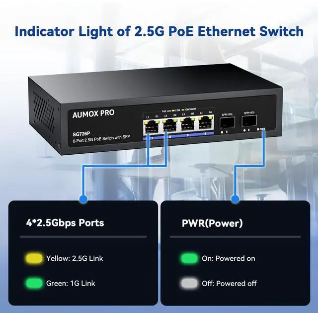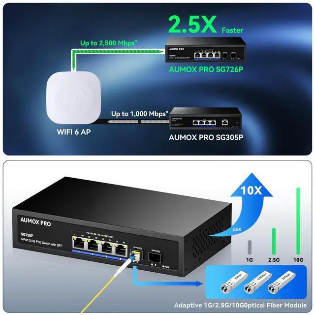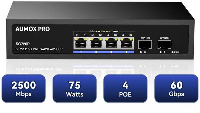 6 Port 2.5G PoE Switch,AUMOX PRO 4 Port 2.5G Network Unmanaged Switch with 2x10G SFP Gigabit Ethernet Unmanaged PoE Switch 75W,Compatible with 100/1000/2500Mbps Plug and Play