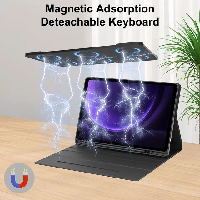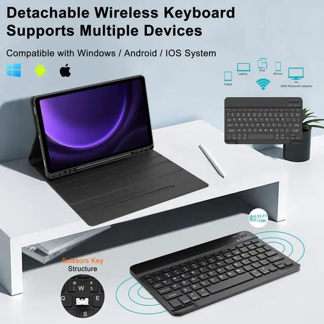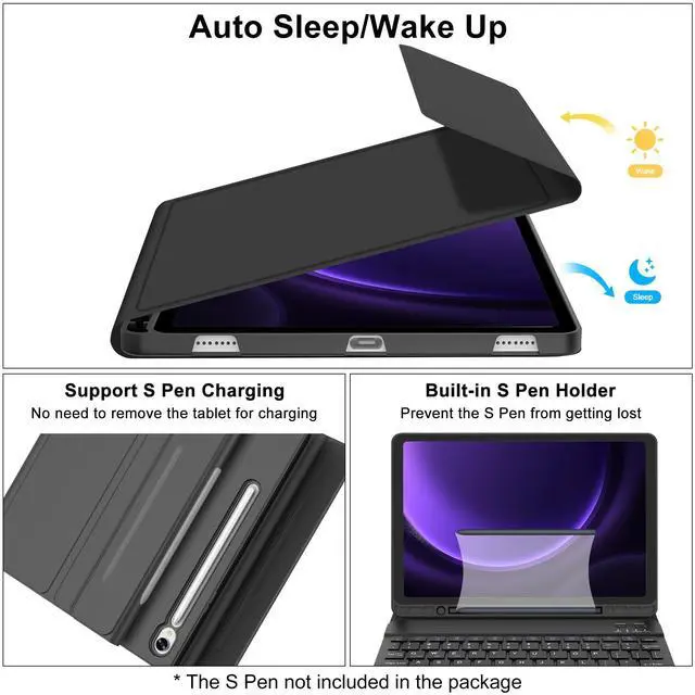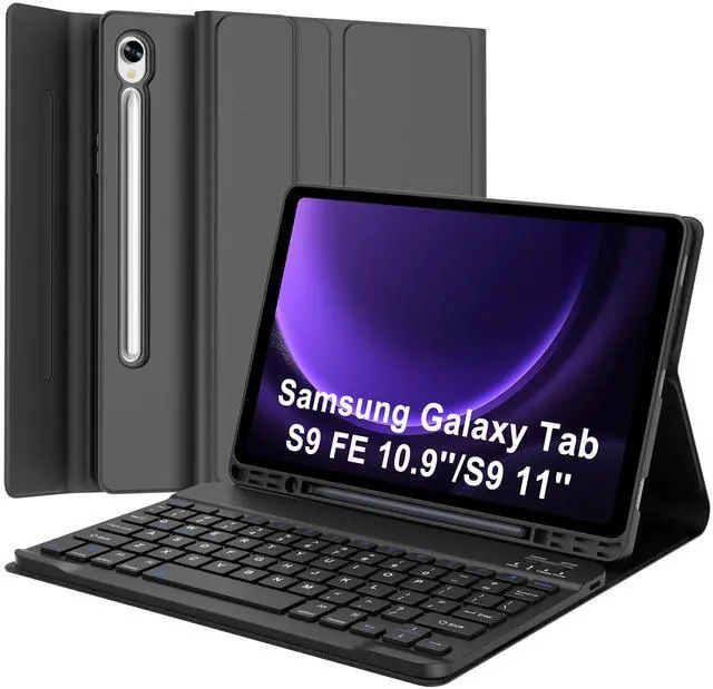 Features: Keyboard case compatible with Samsung Galaxy Tab S10 FE 5G 10.9 inch (Model SM-X520/X526B/X528U). Keyboard case compatible with Samsung Galaxy Tab S9 FE 10.9 inch(Models: SM-X510/X516B/X518U). Keyboard case compatible with Galaxy Tab S9 11 inch (Models: SM-X710/X716B/Xs718U). You can turn your tablet into a highly performance laptop in seconds. Make you look and feel very professional. You can position the tablet however you want to view your screen. The case enable you to position the tablet comfortably, regardless of where/how you are sitting. The pencil holder is on the top, it is different from others that the pencil holder is on the bottom. More easier to place and remove your pencil. Precise cutouts allow full access to all features and offer the all-round protection, convenience for daily use. Keyboard are comfortable for typing, suitable for students and workers. The keyboard featured detachable design, it allows you to typing, reading, painting, viewing. This keyboard case is slim and light. Its good for you work and travel because you do not have to get your laptop with you.
