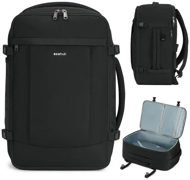 ECOHUB Travel Backpack for Men Women, Carry on Backpack with USB Charging Hole, Spirit Airlines Personal Item Bag Flight Approved, 15.6 Inch Laptop Backpack with Anti Theft Pockets, 30L, Black