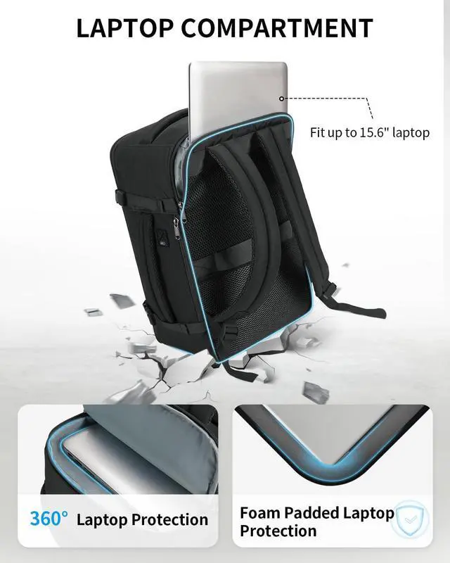 16" LAPTOP COMPARTMENT: This lightweight backpack rear laptop compartment for devices up to 15.6" (Also fits slim 16" laptop). Foam padded provides 360-degree laptop protection while providing comfort for shoulders and back.