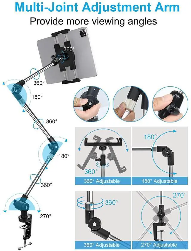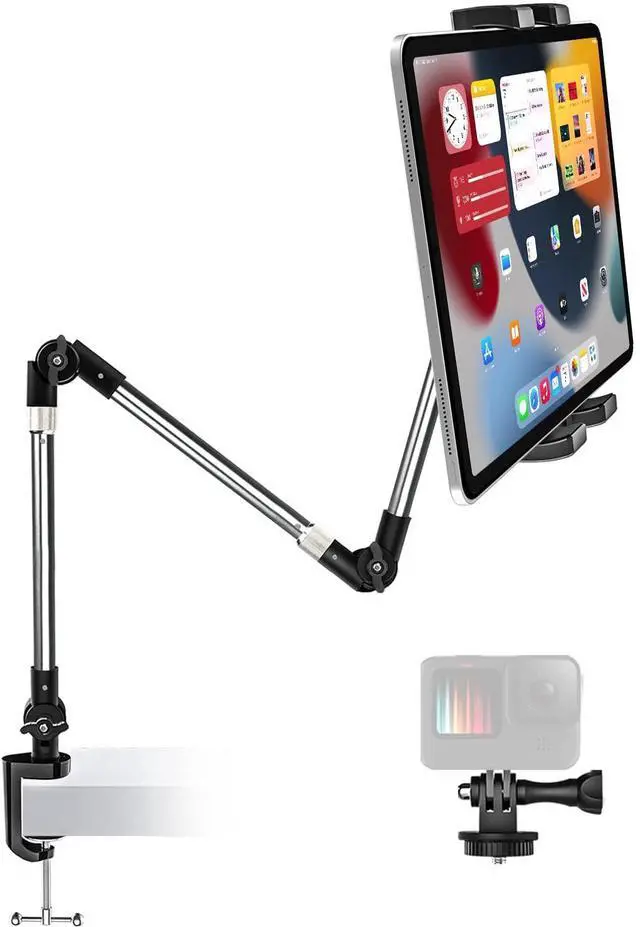 Foldable Adjustable Height And AngleThis desk top fixed stand for tablet action camera is composed of three sections durable aluminum alloy arms.When not in use, the three arms can be easily folded to free up space. tablet boom arm offers max length/height 34inch in horizontal/ vertical distance, and support 360° full rotation and 180° bending in arc.