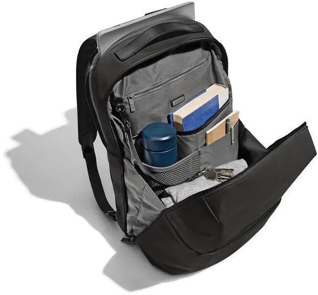Comfort for journeys near and far: Crafted with water repellent nylon, leather trim, padded straps for extra comfort, a breathable mesh back panel, and a top leather handle for easy carrying.