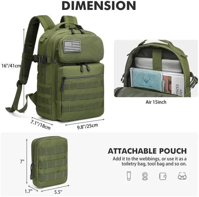 Keep Organized: Multiple compartments and pockets to keep everything organized. Besides, this backpack is designed with an attachable pouch that can be added to the webbings, or use it as a toiletry bag, tool bag and more.