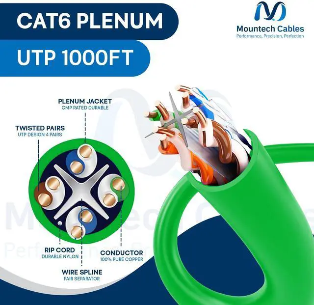 , , / : This 1000ft Cat6 plenum cable uses solid 23AWG bare copper conductors and is certified to EIA/TIA 568-C.2 standards for commercial and residential grade networking. It supports speeds of up to 1 Gbps over 100 meters and up to 10 Gbps over 55 meters. The pure copper Cat6 Plenum cable is ideal for use in homes, schools, offices, data centers, etc.